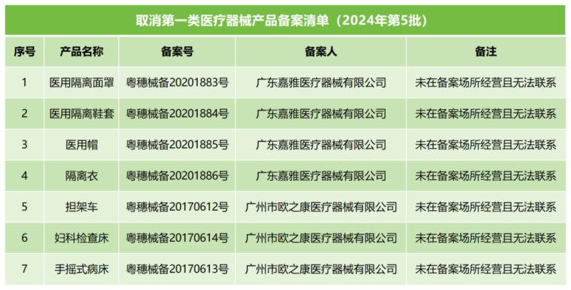 因此,該局現公告取消以上兩家企業的2個第一類醫療器械生產備案(備案號分別為粵穗食藥監械生產備20200352號&粵穗食藥監械生產備20170092號),以及7個第一類醫療器械產品備案,其中產品備案取消的具體清單如下: