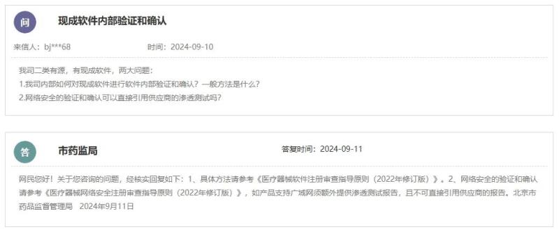 根據北京市藥監局的答復,軟件驗證和確認具體方法可參考《醫療器械軟件注冊審查指導原則(2022年修訂版)》;網絡安全的驗證和確認則可參考《醫療器械網絡安全注冊審查指導原則(2022年修訂版)》,如產品支持廣域網,需額外提供滲透測試報告,且不可直接引用供應商的報告。