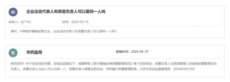 根據北京市藥監局的答復,新版《醫療器械經營質量管理規范》第十四條規定:質量負責人為高層管理人員或者質量管理機構負責人。質量負責人與法人可以為同一人,質量負責人需要在職在崗,盡職履行質量管理職責。