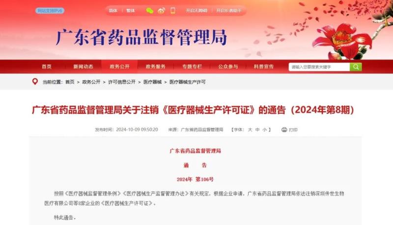 10月9日,廣東藥監局發布通告稱,按照《醫療器械監督管理條例》《醫療器械生產監督管理辦法》有關規定,根據企業申請,該局已于依法注銷深圳傳世生物醫療有限公司、惠州市創榮發實業有限公司、深圳市愛蒂醫療電子有限責任公司等8家企業的《醫療器械生產許可證》,具體明細如下: