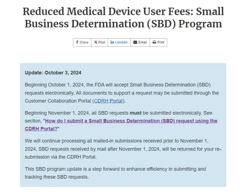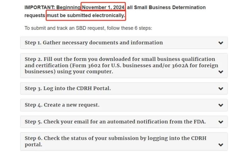 公告提到,從2024年10月1日開始,FDA將接受電子形式的小企業認定(SBD)請求。支持請求的所有文件都可以通過Customer Collaboration Portal(CDRH Portal) 提交。