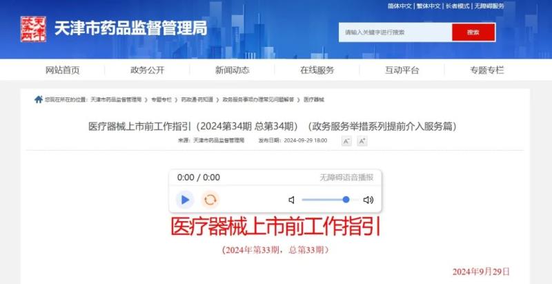 近日,天津市藥監局發布新一期醫療器械上市前工作指引,匯總了醫療器械產品注冊申報前的提前介入服務相關要求,具體如下: