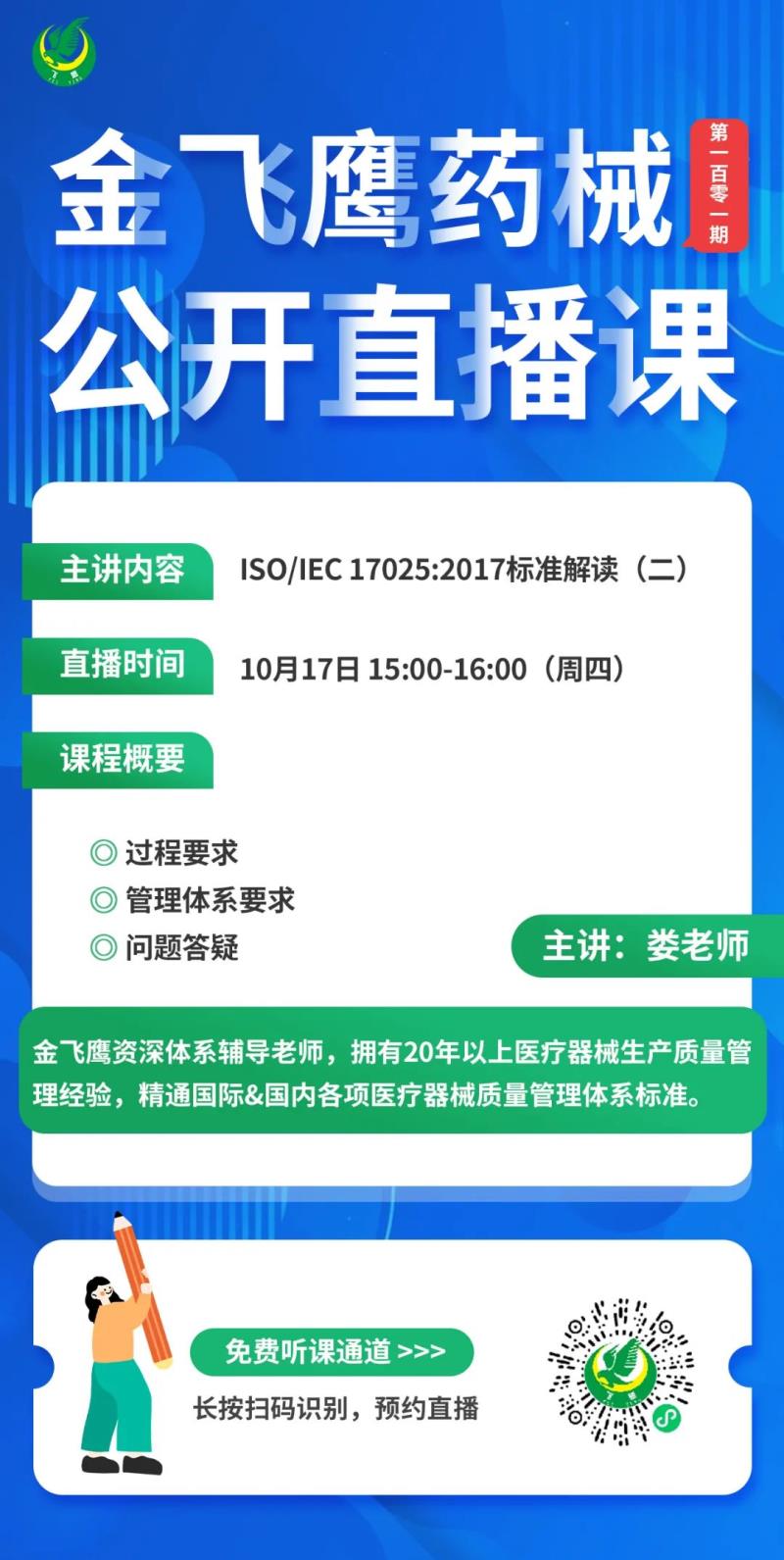 那么,假如企業需提交自檢報告,有哪些具體要求呢?對此,國家藥監局發布了《醫療器械注冊自檢管理規定》(以下簡稱《規定》),以規范注冊申請人注冊自檢工作。作為一項重要的注冊自檢參考文件,《規定》從自檢能力、自檢報告等方面對企業提出了多項要求,其中“自檢能力要求”中提到,“注冊時開展自檢的,注冊申請人應當具備自檢能力,并將自檢工作納入醫療器械質量管理體系,配備與產品檢驗要求相適應的檢驗設備設施。”但在實際應用時企業還是會有不少問題,比如到底如何判斷自身是否具備自檢能力?自檢實驗室有什么要求?根據金飛鷹的日常輔導經驗,結合《規定》要求,企業自檢實驗室應按照ISO/IEC 17025《測試和校準實驗室能力的通用要求》要求實施,因而此次我們給大家安排了ISO/IEC 17025標準解讀的課題,因涉及的內容較多,我們將此主題分成了兩期來講。9月26日的直播課我們給大家帶來了課程第一講,主要講的是基本概念、管理要求、結構要求、資源要求等方面的內容,本次我們繼續給大家帶來標準最后個版塊內容的詳細解讀及一些常見問題答疑。10月17日下午3點,金飛鷹高級項目咨詢師,從事GMP管理相關工作20年,精通國際&國內各項醫療器械質量管理體系標準的婁老師,給大家帶來《ISO/IEC 17025:2017標準解讀(二)》,培訓內容包括過程要求、管理體系要求及問題答疑,想聽課的朋友記得提前預約哦!