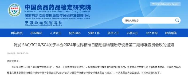 10月16日,中檢院官網轉發了一則標準宣貫會議通知,其中提到,全國醫用電器標準化技術委員會物理治療設備分技術委員會定于10月17日(周四)召開物理治療設備標準宣貫會(線上),具體宣貫內容、時間及參會方式如下: