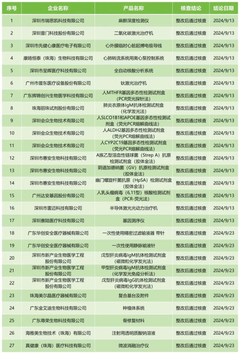 10月17日,廣東省藥監(jiān)局官網(wǎng)公布2024年9月醫(yī)療器械注冊質(zhì)量管理體系核查結(jié)果,包括海雅美生物技術(shù)(珠海)有限公司的注射用透明質(zhì)酸鈉溶液、深圳普門科技股份有限公司的二氧化碳激光治療機(jī)、廣州市普東醫(yī)療設(shè)備股份有限公司的鈥激光治療機(jī)共計(jì)27款產(chǎn)品,核查結(jié)論均為“整改后通過核查”。具體明細(xì)見下方表格: