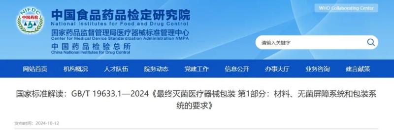 近日,中檢院官網發布了對國家標準GB/T 19633.1-2024《最終滅菌醫療器械包裝 第1部分:材料、無菌屏障系統和包裝系統的要求》的解讀,我們將其轉載如下:
