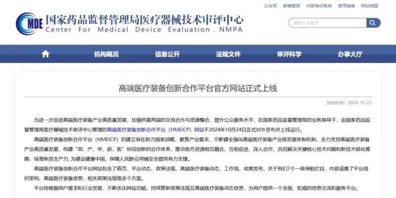 近日,國家藥監(jiān)局器審中心(以下簡稱“器審中心”)發(fā)布動態(tài)稱,由器審中心管理的高端醫(yī)療裝備創(chuàng)新合作平臺(HMEICP)網(wǎng)站已于2024年10月24日正式對外發(fā)布并上線運行。