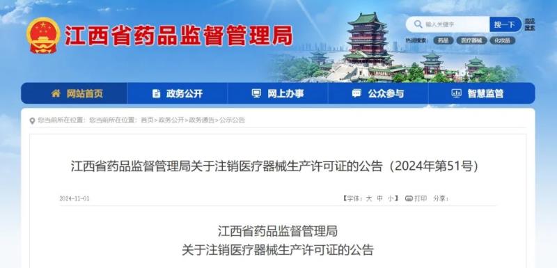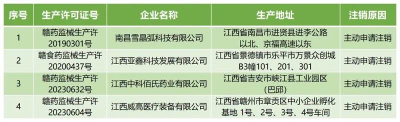 近日,江西省藥監局發布公告稱,該局已依法注銷江西威高醫療裝備有限公司、江西亞鑫科技發展有限公司等4家企業的《醫療器械生產許可證》,注銷原因均為“企業主動申請注銷”,具體明細如下: