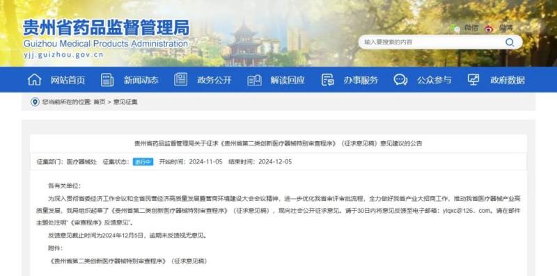 近日,貴州省藥監局發布《貴州省第二類創新醫療器械特別審查程序》(征求意見稿)(以下簡稱《程序》),并向社會公開征求意見。