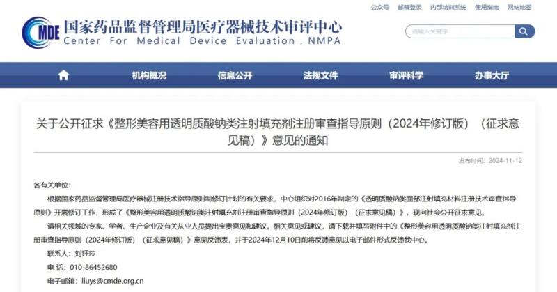 11月12日,國家藥監局器審中心發布《整形美容用透明質酸鈉類注射填充劑注冊審查指導原則(2024年修訂版)(征求意見稿)》(以下簡稱《指導原則》),并向社會公開征求意見。