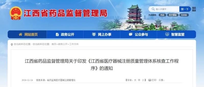 江西藥監局發布《江西省醫療器械注冊質量管理體系核查工作程序》