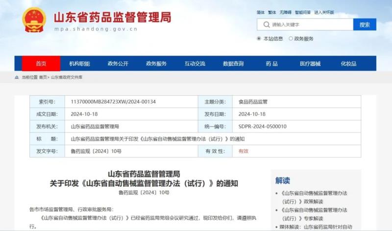 日前,山東省藥監局發布《山東省自動售械監督管理辦法(試行)》(以下簡稱《辦法》),并宣布2024年11月18日起施行。