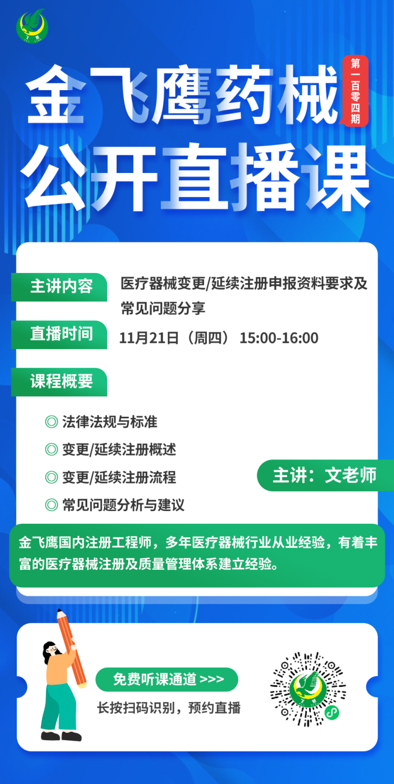 金飛鷹直播培訓簡介 金飛鷹直播培訓,是每周一次的固定培訓欄目,優選金飛鷹國內外資深注冊/項目老師定期為大家講解醫療器械注冊相關知識,解答大家在醫療器械注冊過程中的諸多疑問。 此前我們已為大家帶來新版醫療器械生物學評價標準、新版醫療器械風險管理標準、醫療器械軟件注冊、新版醫療器械經營質量管理規范等共計103次線上培訓課程,有興趣的可點擊視頻號直播回放進行查看~另外大家也一定很關注接下來的培訓主題,相關培訓預告我們會陸續添加至視頻號,請大家持續關注哦!