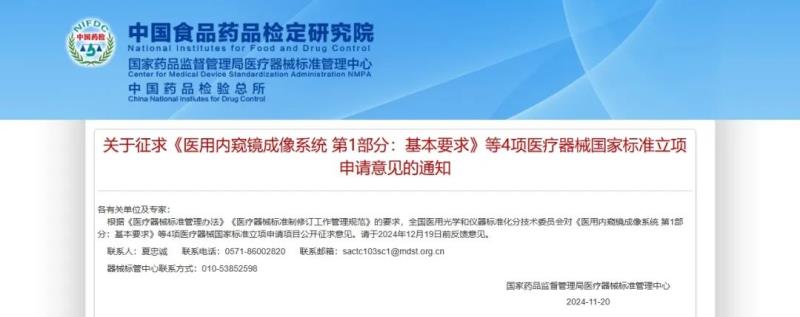 11月20日,國家藥監(jiān)局醫(yī)療器械標(biāo)管中心發(fā)布《醫(yī)用內(nèi)窺鏡成像系統(tǒng) 第1部分:基本要求 》《醫(yī)用內(nèi)窺鏡成像系統(tǒng) 第4部分:熒光性能》《醫(yī)用內(nèi)窺鏡成像系統(tǒng)第5部分:3D性能》《角膜塑形用硬性透氣接觸鏡》共4項(xiàng)2025年醫(yī)療器械國家標(biāo)準(zhǔn)立項(xiàng)申請(qǐng)意見的通知,同時(shí)隨附了各項(xiàng)標(biāo)準(zhǔn)草案,并向社會(huì)公開征求意見。