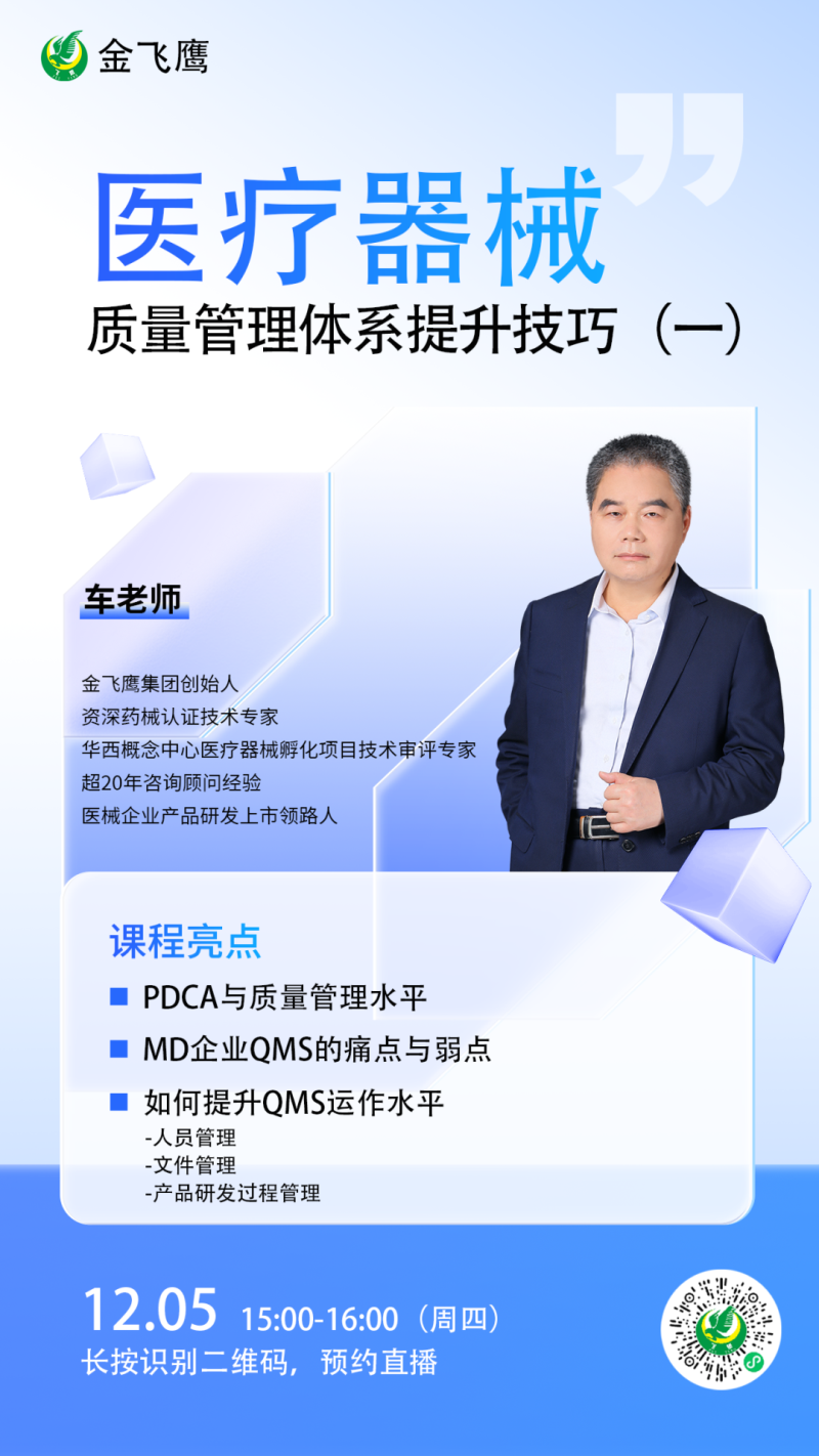 金飛鷹直播培訓簡介 金飛鷹直播培訓,是每周一次的固定培訓欄目,優選金飛鷹國內外資深注冊/項目老師定期為大家講解醫療器械注冊相關知識,解答大家在醫療器械注冊過程中的諸多疑問。 此前我們已為大家帶來新版醫療器械生物學評價標準、新版醫療器械風險管理標準、醫療器械軟件注冊、新版醫療器械經營質量管理規范等共計105次線上培訓課程,有興趣的可點擊視頻號直播回放進行查看~另外大家也一定很關注接下來的培訓主題,相關培訓預告我們會陸續添加至視頻號,請大家持續關注哦!