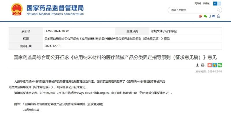 12月10日,國家藥監局發布《應用納米材料的醫療器械產品分類界定指導原則(征求意見稿)》(以下簡稱《指導原則》),并向社會公開征求意見。