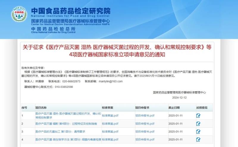 12月12日,國家藥監局醫療器械標管中心發布《醫療產品滅菌濕熱醫療器械滅菌過程的開發、確認和常規控制要求》《醫療產品滅菌 輻射 第4部分:過程特征及控制指南》《醫療產品的無菌加工第1部分:通用要求》《醫療產品滅菌 微生物學方法 第3部分:細菌內毒素檢查》共4醫療器械國家標準立項申請意見的通知,同時隨附了各項標準草案,并向社會公開征求意見。