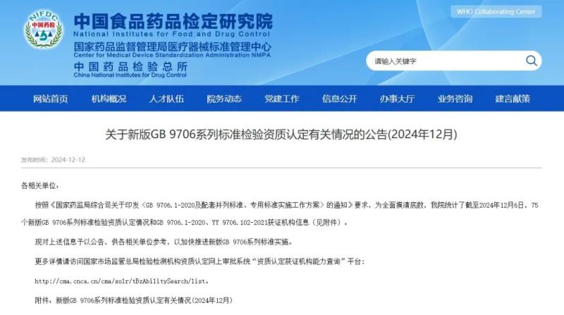 近日,中檢院官網公布了截至2024年12月6日,75個新版GB 9706系列標準檢驗資質認定情況和GB 9706.1-2020、YY 9706.102-2021獲證機構信息。