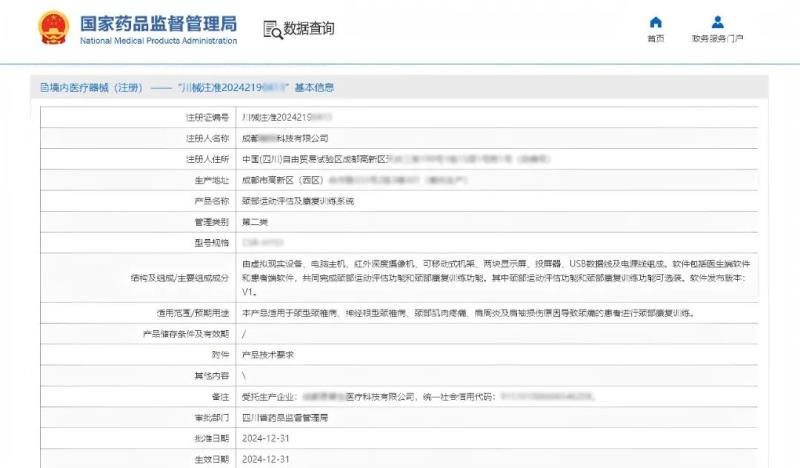 近日,金飛鷹輔導的成都一家企業成功取得了【頸部運動評估及康復訓練系統】的醫療器械注冊證,我們從該注冊證上展示的信息可以看出,這是一款將虛擬現實技術與計算機視覺技術相結合的產品,預期用途為“適用于頸型頸椎病、神經根型頸椎病、頸部肌肉疼痛、肩周炎及肩袖損傷原因導致頸痛的患者進行頸部康復訓練。”