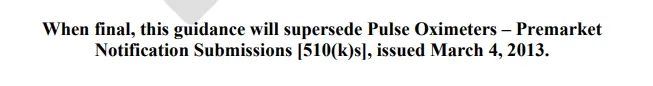 的來說,本指導文件草案提供了 FDA 關于非臨床和臨床性能測試的建議,以支持醫(yī)療用脈搏血氧儀(包括具有脈搏血氧儀功能的設備)的上市前提交。提出這些建議的部分原因是擔心脈搏血氧儀的準確性會受到人的皮膚色素沉著等因素的影響,同時為這些器械的性能評估提供信息,以支持上市前提交(無論提交類型如何),確保一致性,以促進對這些提交的高效審查。