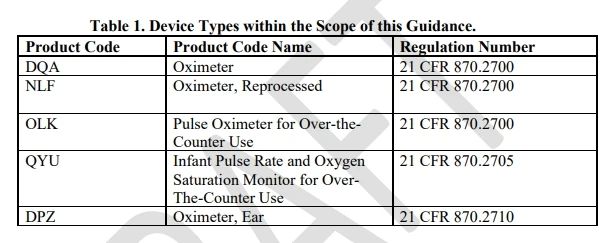 1、設備描述:設備適用范圍增加了產品代碼為QYU,OLK的血氧儀,其中QYU為非處方嬰兒脈率和血氧飽和度監(jiān)測儀,OLK為非處方使用的脈搏血氧儀。適用的血氧儀設備產品代碼見下表。