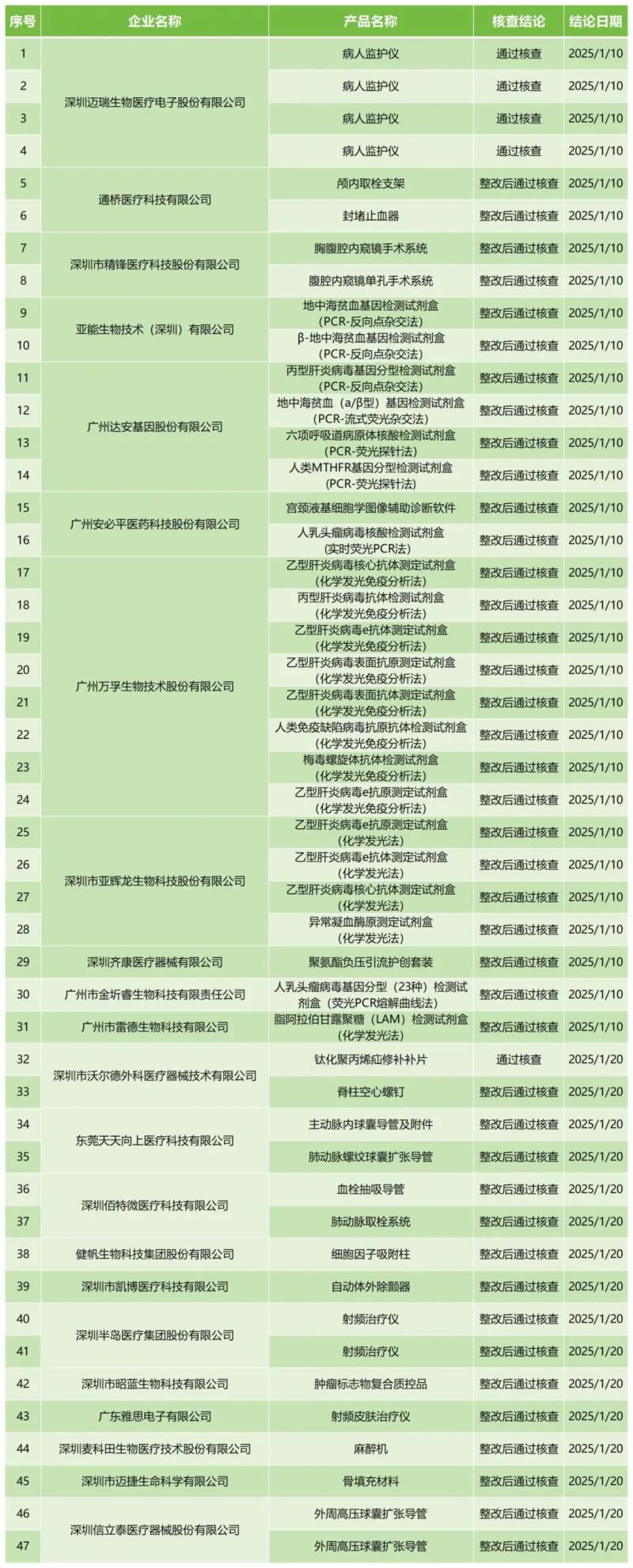 2月12日,廣東省藥監(jiān)局官網(wǎng)公布2025年1月醫(yī)療器械注冊(cè)質(zhì)量管理體系核查結(jié)果,包括深圳邁瑞生物醫(yī)療電子股份有限公司的四款病人監(jiān)護(hù)儀深圳半島醫(yī)療集團(tuán)股份有限公司的兩款射頻治療儀廣東雅思電子有限公司射頻皮膚治療儀共計(jì)47款產(chǎn)品,其中有五款產(chǎn)品核查結(jié)論為“通過核查”,其余均為“整改后通過核查”。具體明細(xì)見下方表格: