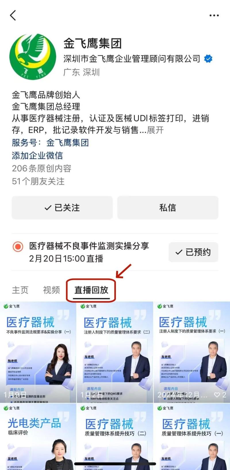 往期直播培訓(xùn)課程支持回放,關(guān)注“金飛鷹藥械咨詢服務(wù)”視頻號(hào)并點(diǎn)擊視頻號(hào)主頁(yè),即可查看“直播回放”哦~