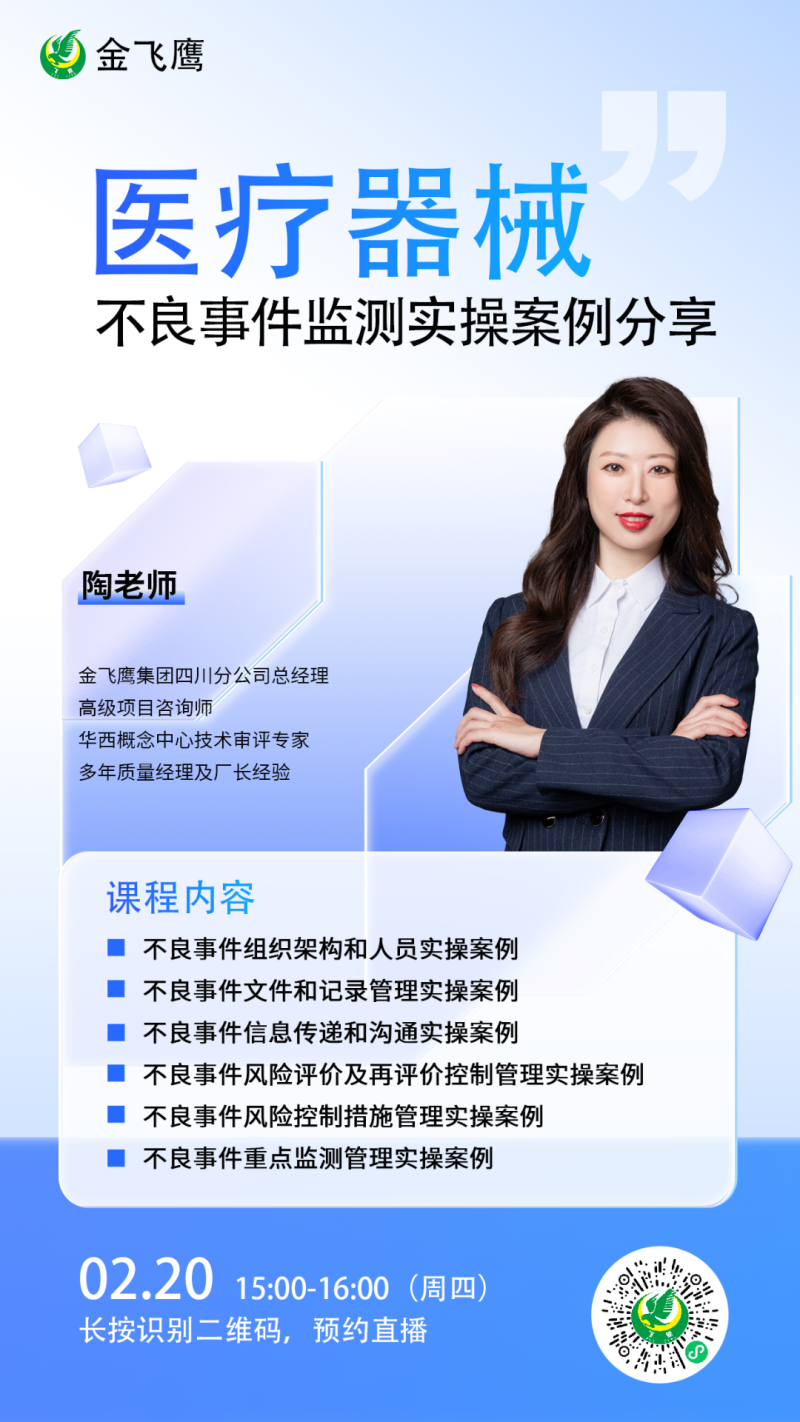 金飛鷹直播培訓(xùn)簡(jiǎn)介 金飛鷹直播培訓(xùn),是每周一次的固定培訓(xùn)欄目,優(yōu)選金飛鷹國(guó)內(nèi)外資深注冊(cè)/項(xiàng)目老師定期為大家講解醫(yī)療器械注冊(cè)相關(guān)知識(shí),解答大家在醫(yī)療器械注冊(cè)過(guò)程中的諸多疑問(wèn)。 此前我們已為大家?guī)?lái)新版醫(yī)療器械生物學(xué)評(píng)價(jià)標(biāo)準(zhǔn)、新版醫(yī)療器械風(fēng)險(xiǎn)管理標(biāo)準(zhǔn)、醫(yī)療器械軟件注冊(cè)、醫(yī)療器械質(zhì)量管理體系提升技巧等共計(jì)111次線上培訓(xùn)課程,有興趣的可點(diǎn)擊視頻號(hào)直播回放進(jìn)行查看~另外大家也一定很關(guān)注接下來(lái)的培訓(xùn)主題,相關(guān)培訓(xùn)預(yù)告我們會(huì)陸續(xù)添加至視頻號(hào),請(qǐng)大家持續(xù)關(guān)注哦!
