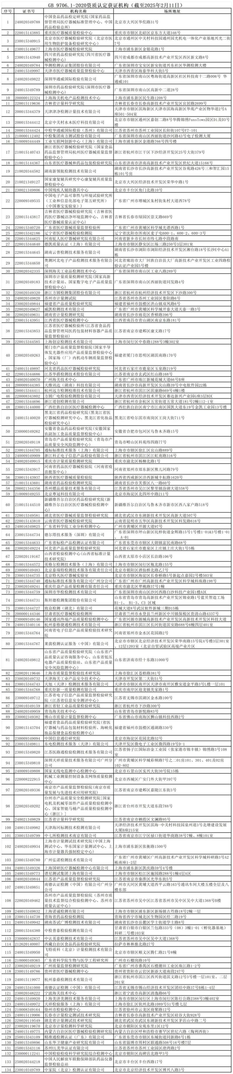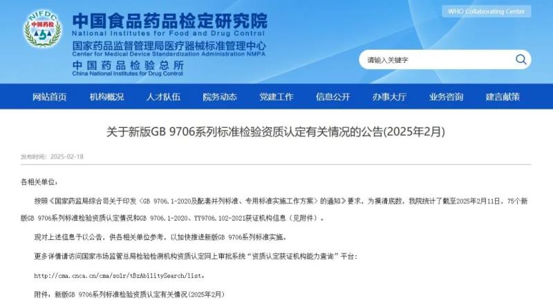 近日,中檢院官網公布了截至2025年2月11日,75個新版GB 9706系列標準檢驗資質認定情況和GB 9706.1-2020、YY 9706.102-2021獲證機構信息。