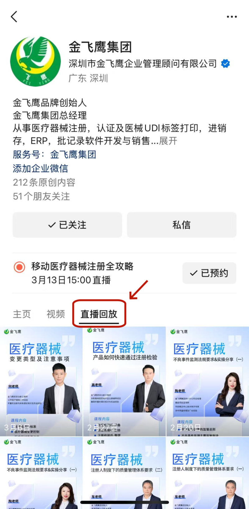 往期直播培訓課程支持回放,關注“金飛鷹藥械咨詢服務”視頻號并點擊視頻號主頁,即可查看“直播回放”哦~