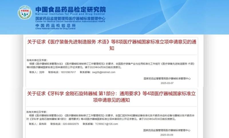 近日,國家藥監局醫療器械標管中心發布《醫療裝備先進制造服務術語》《摻銩光纖激光治療機技術要求》《牙科學 金剛石旋轉器械 第1部分:通用要求》等12項醫療器械國家標準立項申請意見的通知,同時隨附了各項標準草案,并向社會公開征求意見,意見征求時間均為一個月。