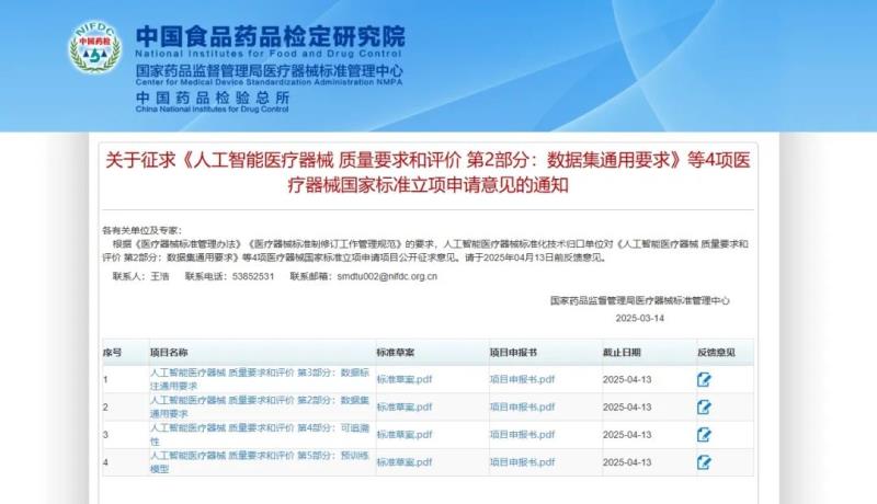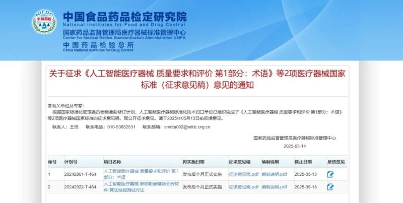 3月14日,國家藥監局醫療器械標準管理中心發布《人工智能醫療器械 質量要求和評價 第1部分:術語》《人工智能醫療器械 肺部影像輔助分析軟件 算法性能測試方法》2項醫療器械國家標準的征求意見稿,并向社會公開征求意見。