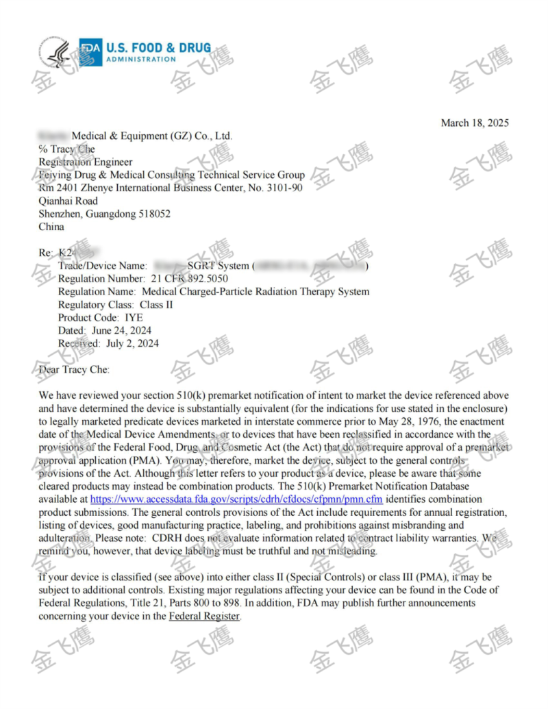 隨著技術的進步和數字化轉型的加速,醫療器械行業正經歷著前所未有的變革。然而,網絡攻擊的增加和數據泄露事件的頻發,醫療器械的網絡安全問題也日益凸顯。因此,各國監管機構對網絡安全的審查力度不斷加碼,要求企業從設計到售后全生命周期內確保設備的安全性和可靠性。 而在這一全球趨勢中,美國FDA對網絡安全的要求更是以“零容忍”態度走在前列:風險預判、漏洞管理、數據加密、模擬攻擊測試……任何一項疏漏都可能導致認證失敗。 3月18日,金飛鷹輔導的廣州一家企業的SGRT系統(表面引導放射治療系統)成功獲批FDA 510(k),此類產品安全等級較高,FDA在對其上市申報資料審查較為嚴格,這無疑對資料編寫的的專業能力提出了極高的要求。而在這一案例中,特別值得一提的是,我們輔導客戶編寫的網絡安全資料一次性通過,極好地彰顯了我們對FDA網絡安全要求的精準把握。