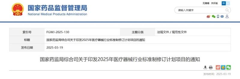 3月19日,國(guó)家藥監(jiān)局正式發(fā)布《關(guān)于印發(fā)2025年醫(yī)療器械行業(yè)標(biāo)準(zhǔn)制修訂計(jì)劃項(xiàng)目的通知》,共確定了2025年85項(xiàng)醫(yī)療器械行業(yè)標(biāo)準(zhǔn)制修訂計(jì)劃項(xiàng)目,其中包括《熱傳導(dǎo)式理療設(shè)備通用技術(shù)要求》《激光治療設(shè)備 摻鈥釔鋁石榴石激光治療機(jī)》等6項(xiàng)強(qiáng)制性醫(yī)療器械行業(yè)標(biāo)準(zhǔn)及《重組膠原蛋白降解試驗(yàn)方法通則》《接觸性創(chuàng)面敷料試驗(yàn)方法 第7部分:微生物學(xué)》《接觸性創(chuàng)面敷料試驗(yàn)方法 第8部分:生物學(xué)》等79項(xiàng)推薦性醫(yī)療器械行業(yè)標(biāo)準(zhǔn),同時(shí)明確了歸口單位及承擔(dān)單位,具體明細(xì)如下: