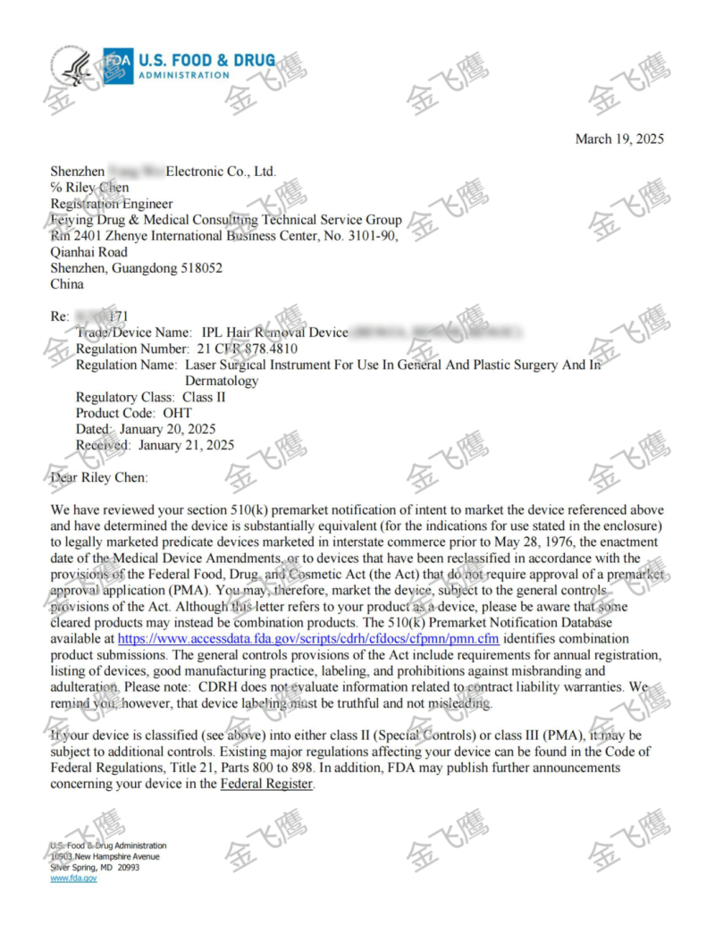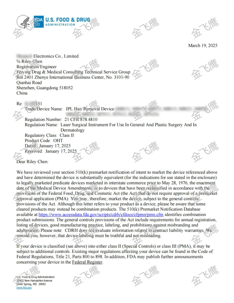 憑借我們深耕行業(yè)18年的深厚積淀與卓越的技術(shù)實力,近日金飛鷹連續(xù)輔導多家企業(yè)的多款產(chǎn)品獲批FDA 510(k),其中包括氣壓腿部按摩器SGRT系統(tǒng)以及今天的主角——我們申請的首例雙脈沖脫毛儀。這一系列成功案例,不僅彰顯了我們在醫(yī)療器械注冊咨詢領(lǐng)域的專業(yè)實力和行業(yè)領(lǐng)軍地位,更為國內(nèi)醫(yī)械企業(yè)加速布局海外市場提供了堅實的技術(shù)支持與戰(zhàn)略保障。