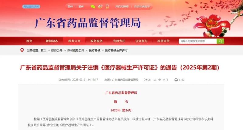 近日,廣東藥監局發布通告稱,按照《醫療器械監督管理條例》《醫療器械生產監督管理辦法》有關規定,根據企業申請,該局已于依法注銷注銷深圳市樂夫科技有限公司、東莞市泰杉科技工業有限公司等3家企業的《醫療器械生產許可證》,具體明細如下: