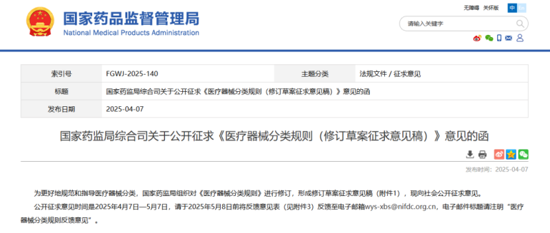 4月7日,國家藥監局發布《醫療器械分類規則(修訂草案征求意見稿)》,并向社會公開征求意見。