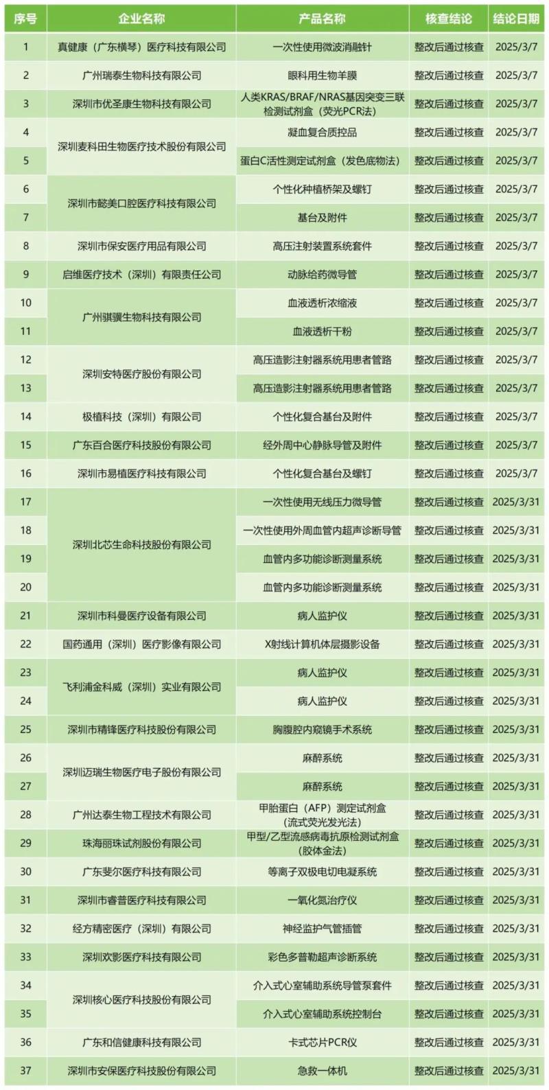 4月10日,廣東省藥監(jiān)局官網(wǎng)公布2025年3月醫(yī)療器械注冊質(zhì)量管理體系核查結(jié)果,包括真健康(廣東橫琴)醫(yī)療科技有限公司的一次性使用微波消融針、深圳市科曼醫(yī)療設(shè)備有限公司的病人監(jiān)護儀、深圳市精鋒醫(yī)療科技股份有限公司的胸腹腔內(nèi)窺鏡手術(shù)系統(tǒng)、深圳邁瑞生物醫(yī)療電子股份有限公司的麻醉系統(tǒng)等共計37款產(chǎn)品,均為“整改后通過核查”。具體明細見下方表格: