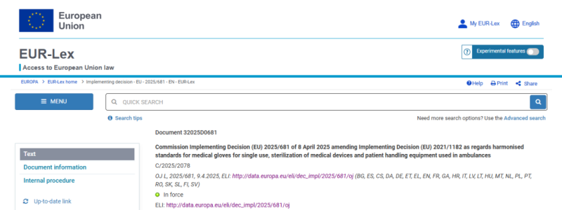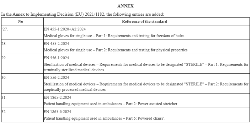 近日,歐盟委員會發布公告稱,根據2025 年 4 月 8 日歐盟委員會第 2025/681 號實施決定,修訂了關于一次性醫用手套的協調標準 EN 455-1:2020 和 EN 455-2:2015、關于醫療器械滅菌的協調標準 EN 556-1:2001《醫療器械滅菌-標記為“無菌”的醫療器械的要求-第 1 部分:最終滅菌醫療器械的要求》和 EN 556-2:2015《醫療器械滅菌-標記為“無菌”的醫療器械的要求-第 2 部分:無菌加工醫療器械的要求》,以及關于救護車使用的患者處理設備的 EN 1865-2:2010+A1:2015,并起草了關于救護車使用的患者處理設備的協調標準 EN 1865-6,具體明細如下: