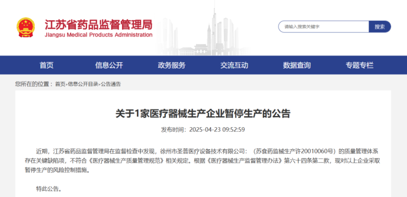 近日,江蘇省藥監局發布公告稱,該局在監督檢查中發現,徐州市**醫療設備技術有限公司(蘇食藥監械生產許20010060號)的質量管理體系存在關鍵缺陷項,不符合《醫療器械生產質量管理規范》相關規定。根據《醫療器械生產監督管理辦法》第六十四條第二款,現對以上企業采取暫停生產的風險控制措施。