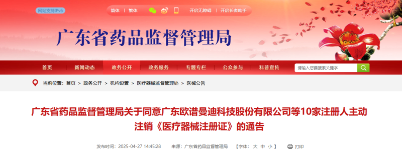 4月27日,廣東省藥監(jiān)局發(fā)布公告稱,廣東歐譜曼迪科技股份有限公司、深圳市樂夫科技有限公司、華為終端有限公司等10家注冊人向廣東省藥品監(jiān)督管理局主動(dòng)提出注銷產(chǎn)品注冊證的申請。根據(jù)《醫(yī)療器械監(jiān)督管理?xiàng)l例》的規(guī)定,現(xiàn)對(duì)該10家注冊人持有的16張《醫(yī)療器械注冊證》依法予以注銷,包括鼻竇鏡、多參數(shù)監(jiān)護(hù)儀、腕部單導(dǎo)心電采集器等,具體明細(xì)如下: