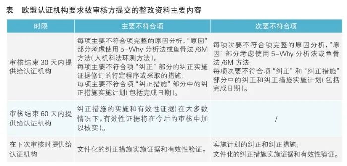 針對審核發(fā)現(xiàn)的不符合項,歐盟認(rèn)證機構(gòu)要求被審核方提交原因分析、糾正措施等整改資料(詳見表)。