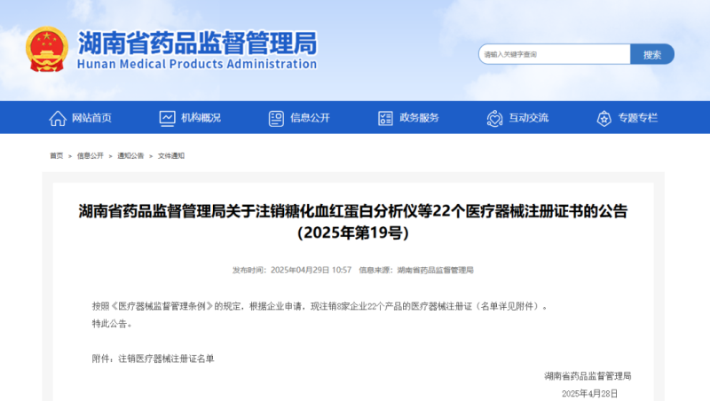 4月29日,湖南省藥監局發布公告稱,按照《醫療器械監督管理條例》的規定,根據企業申請,現注銷湖南普門醫療科技有限公司、湖南雷杜生物技術有限公司等8家企業的22個產品的醫療器械注冊證,具體明細如下: