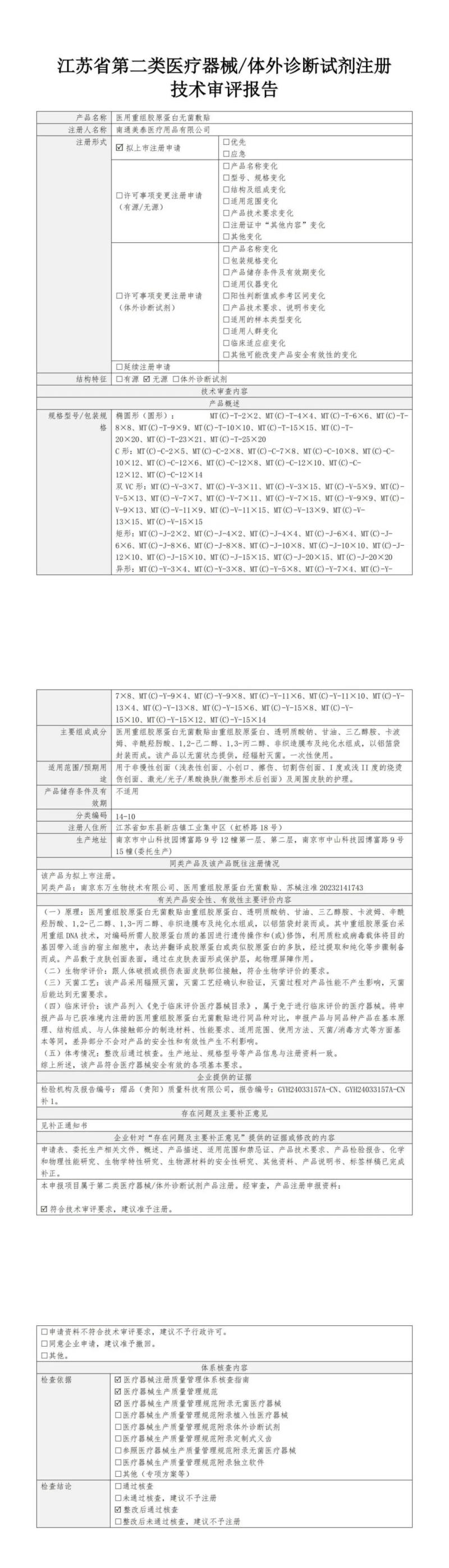 5月12日,江蘇省藥監(jiān)局公布了2025年4月批準注冊的水性聚氨酯避孕套、醫(yī)用透明質酸鈉液體敷料、醫(yī)用重組膠原蛋白液體敷料、低頻治療儀、中頻治療儀、足底壓力步態(tài)評估系統(tǒng)、視頻可視喉鏡、超短波治療儀、增材制造肺部穿刺導板224醫(yī)療器械產品目錄,同時隨附了所有產品的技術審評報告,我們其中“醫(yī)用重組膠原蛋白無菌敷貼”[預期用途于非慢性創(chuàng)面(淺表性創(chuàng)面、小創(chuàng)口、擦傷、切割傷創(chuàng)面、Ⅰ度或淺Ⅱ度的燒燙傷創(chuàng)面、激光/光子/果酸換膚/微整形術后創(chuàng)面)及周圍皮膚的護理]的技術審評報告以圖片形式轉載如下: