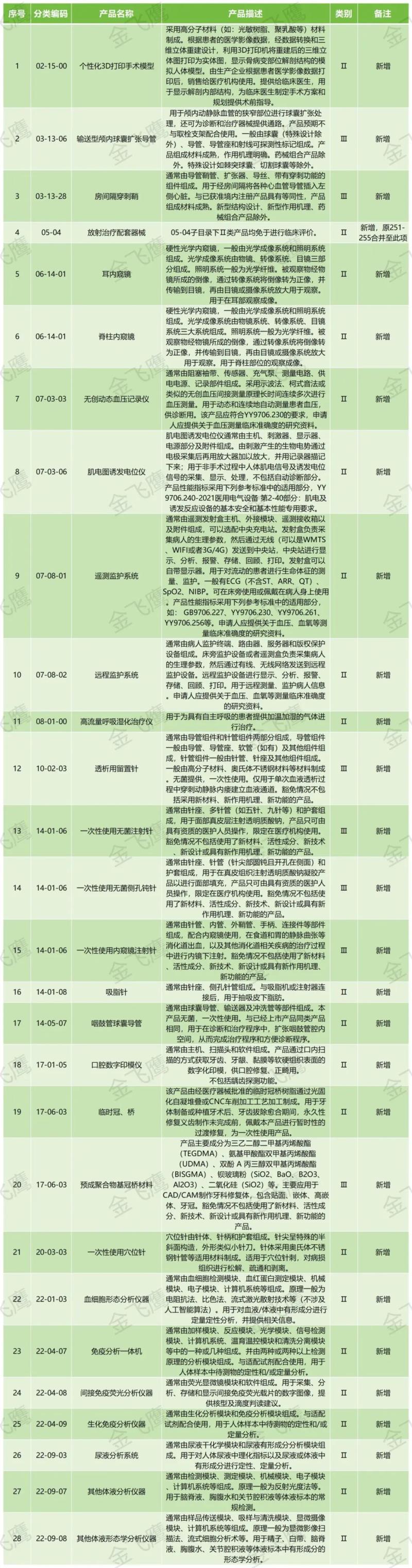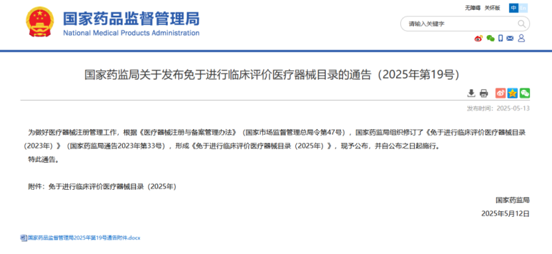 5月13日,國(guó)家藥監(jiān)局官網(wǎng)發(fā)布《免于進(jìn)行臨床評(píng)價(jià)醫(yī)療器械目錄(2025年)》(以下簡(jiǎn)稱(chēng)《目錄》),本次《目錄》中共包含1047類(lèi)(2023年為1025類(lèi))產(chǎn)品,通過(guò)查看附件我們可以發(fā)現(xiàn),本次新增的免臨床產(chǎn)品包括個(gè)性化3D打印手術(shù)模型、無(wú)創(chuàng)動(dòng)態(tài)血壓記錄儀、遠(yuǎn)程監(jiān)護(hù)系統(tǒng)、一次性使用無(wú)菌注射針(用于面部真皮層注射透明質(zhì)酸鈉)等。由于《目錄》全文字?jǐn)?shù)較多,不便在文章中全部展示,我們僅將本次新增的免臨床評(píng)價(jià)產(chǎn)品匯總?cè)缦拢怨┫嚓P(guān)企業(yè)參考: