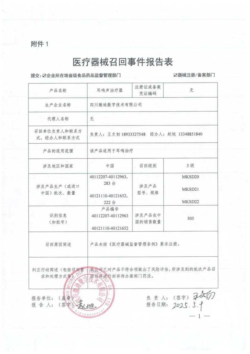 近日,四川省藥監局發布一則醫療器械召回公告,其中提到,四川微迪數字技術有限公司報告,由于未取得醫療器械注冊證,主動召回其生產的耳鳴聲治療器。召回級別為三級,涉及產品的型號、規格及批次等詳細信息如下: