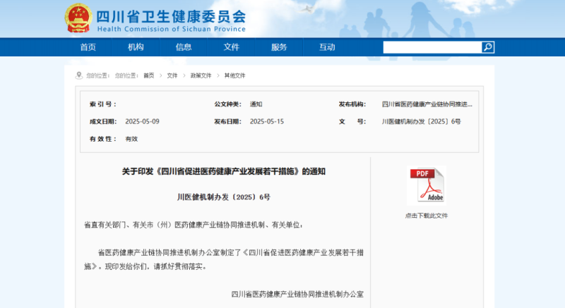 近日,四川省醫藥健康產業鏈協同推進機制辦公室發布《四川省促進醫藥健康產業發展若干措施》(以下簡稱《若干措施》),共從5個方面提出了21條措施。