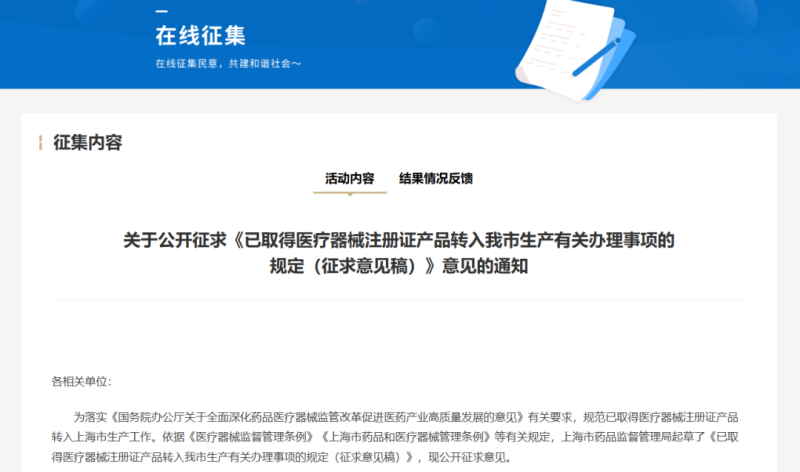 近日,上海市藥監局發布《已取得醫療器械注冊證產品轉入我市生產有關辦理事項的規定》(以下簡稱《規定),并向社會公開征求意見。