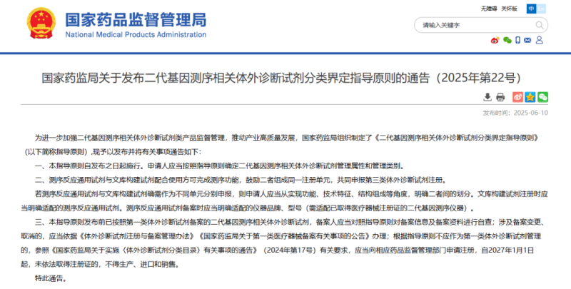 6月10日,國家藥監局發布《二代基因測序相關體外診斷試劑分類界定指導原則》(以下簡稱《指導原則》),并就《指導原則》實施的有關事項通告如下: