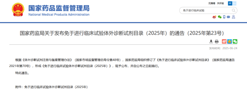 6月24日,國家藥監局發布《免于進行臨床試驗體外診斷試劑目錄(2025年)》(以下簡稱“2025年目錄”),共有445類IVD產品可免于臨床試驗,其中Ⅲ類產品27種,Ⅱ類產品418種。我們通過與《免于臨床試驗體外診斷試劑目錄(2021年)》進行簡單對比,2025年目錄中新增的免于臨床試驗產品大概有這些(可能會有疏漏,歡迎指正):